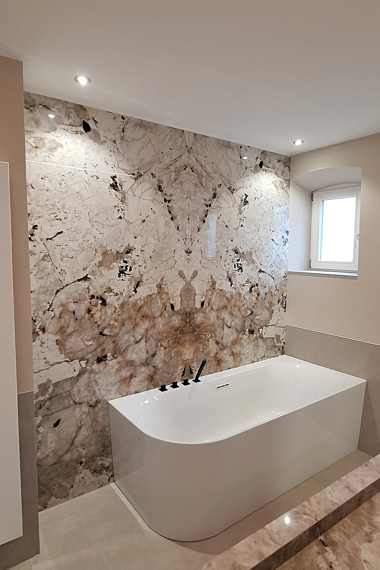In diesem Bad wurde mit großformatiger Keramik ein echtes Statement gesetzt. Die Wandflächen hinter Wanne und Waschtisch sind in Florimstone Tundra ausgeführt und als durchgehendes Bookmatch verlegt. So entsteht ein spiegelsymmetrisches, beinahe kunstvolles Bild mit warmen Beige-, Braun- und Naturtönen, das dem Raum Tiefe und Charakter verleiht.
