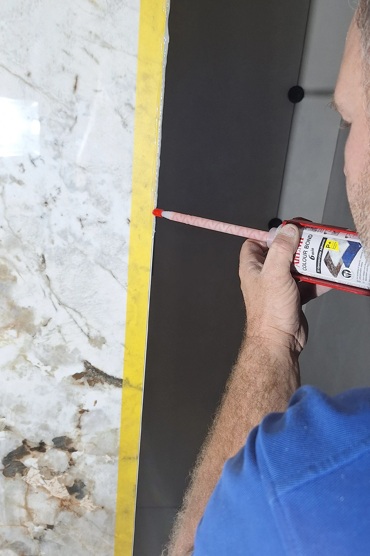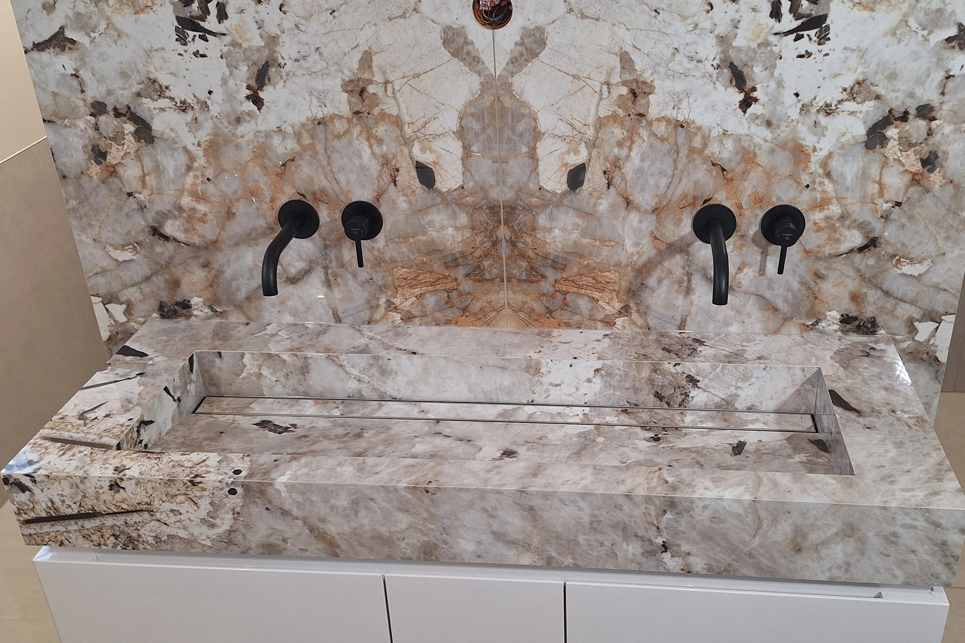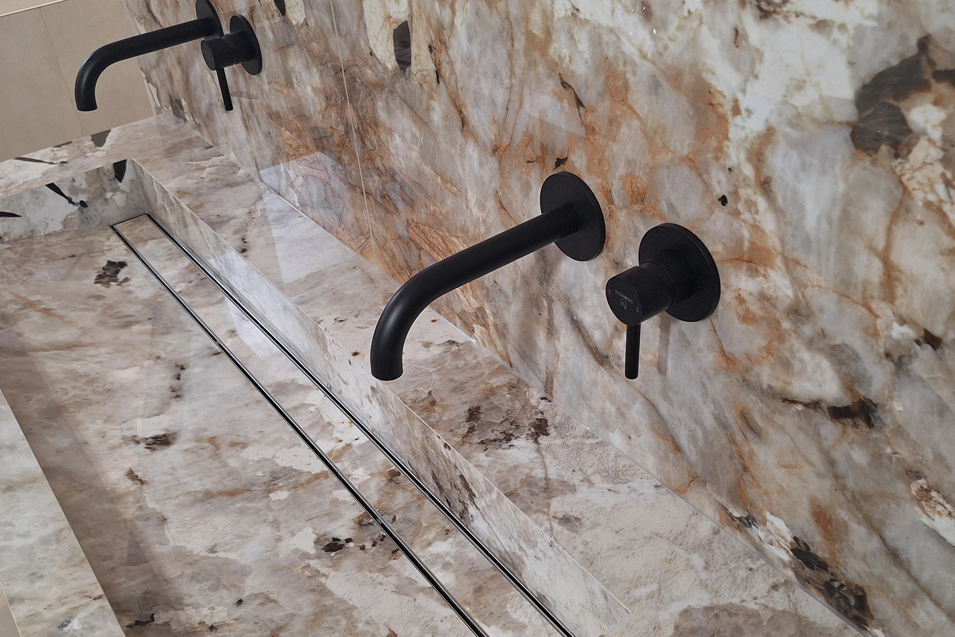 Alle sichtbaren Kanten wurden in Massivoptik auf Gehrung verklebt. Dadurch wirken Wanneinfassung, Waschtisch und Wandverkleidungen wie aus einem Stück gefertigt. Das maßgefertigte Waschbecken – eine Eigenfertigung aus Florimstone Tundra – greift die Zeichnung der Wand auf und führt sie präzise weiter.