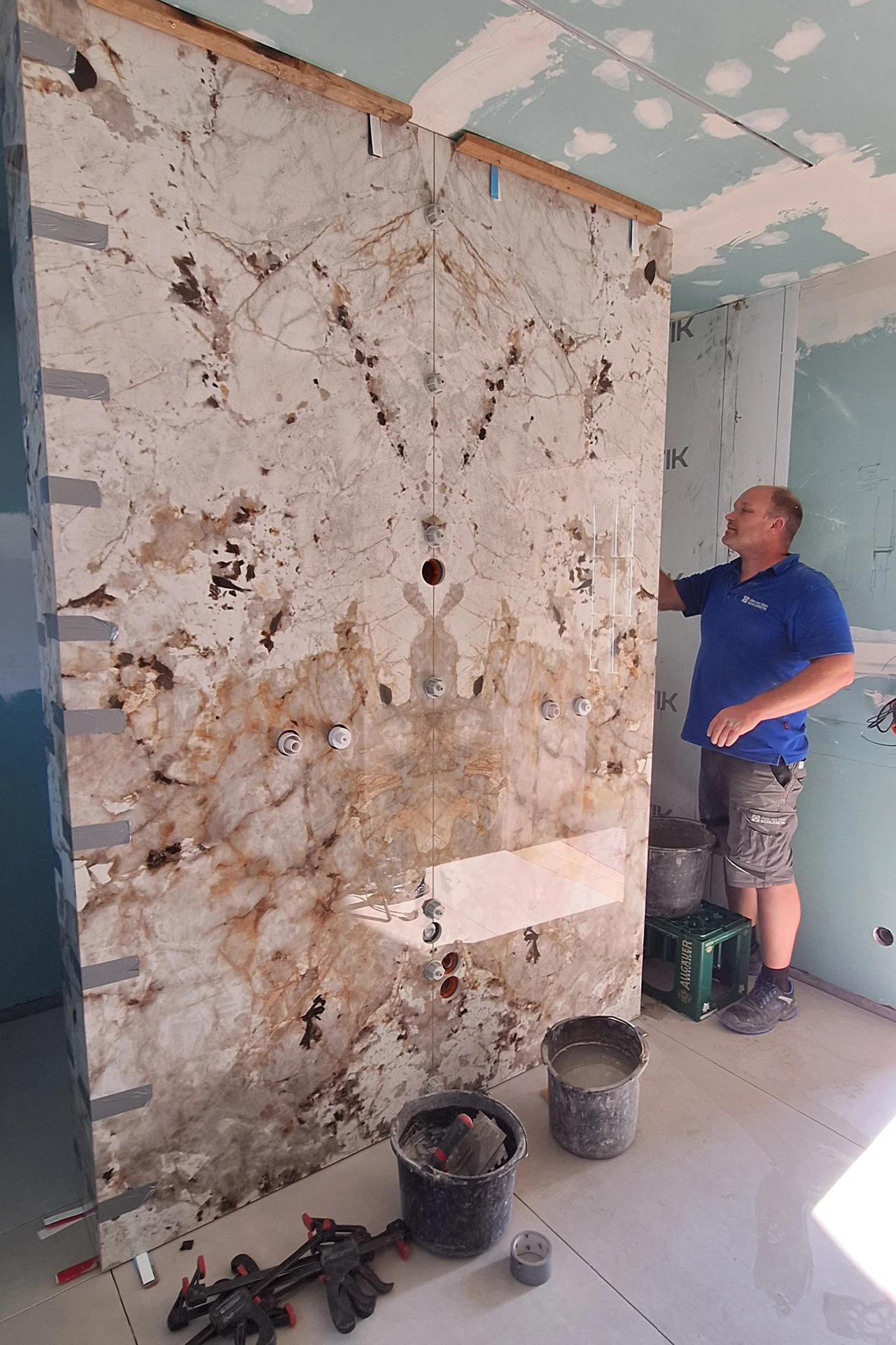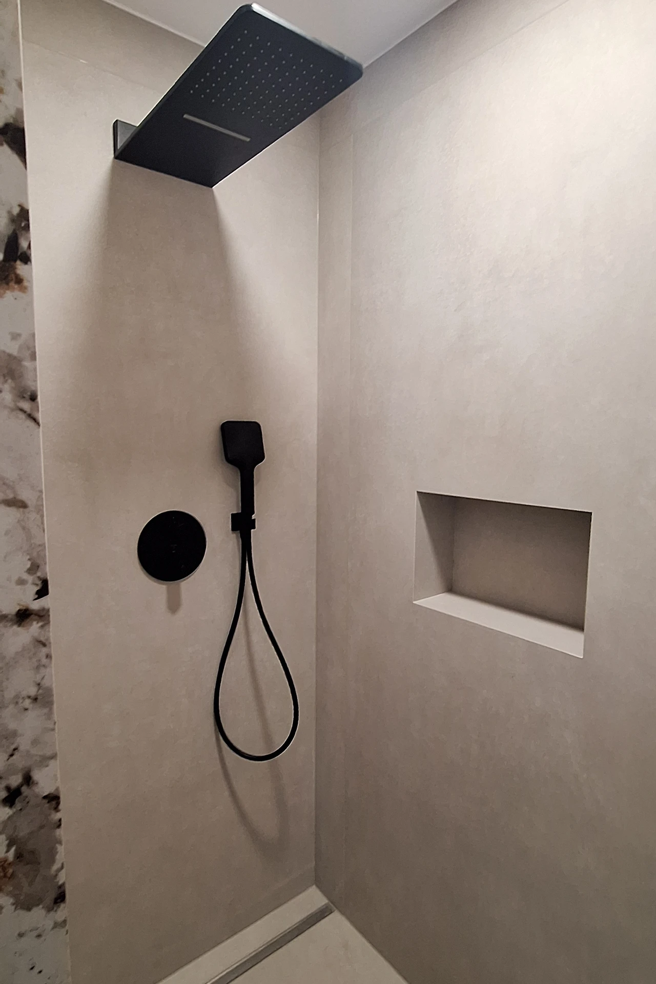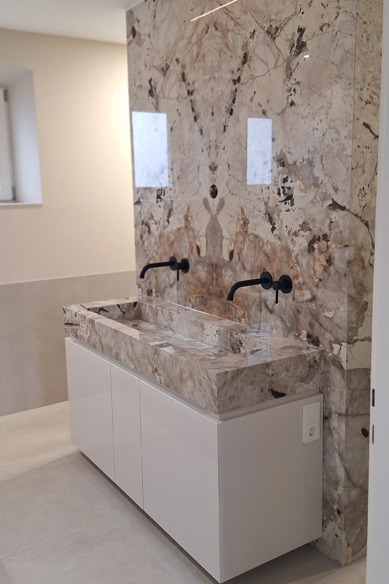 Auch der Boden ist in Großkeramik von Florim ausgeführt und fügt sich harmonisch in das Gesamtkonzept ein. In Kombination mit den mattschwarzen Armaturen entsteht ein modernes, hochwertiges Bad, das Eleganz und präzises Handwerk vereint.