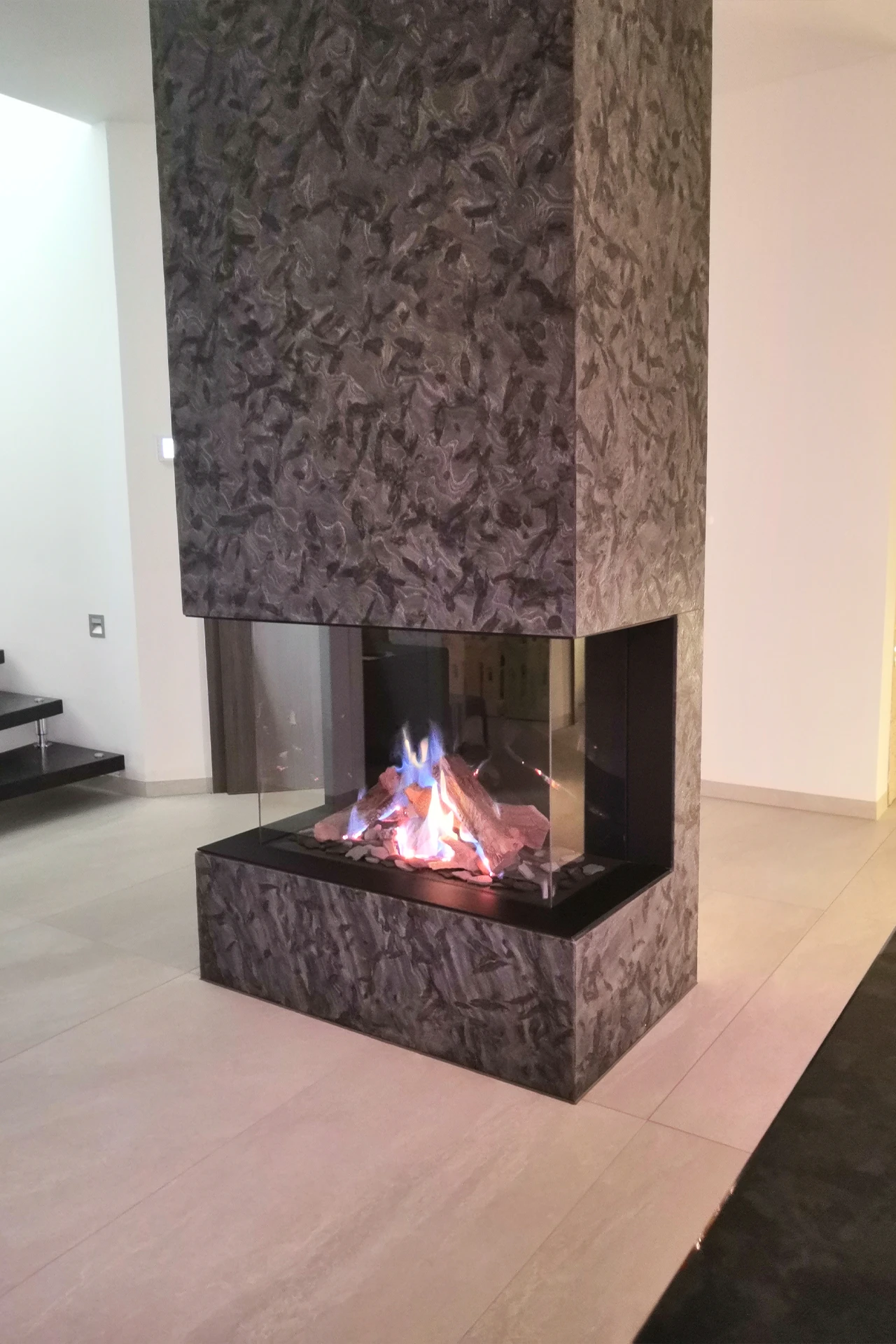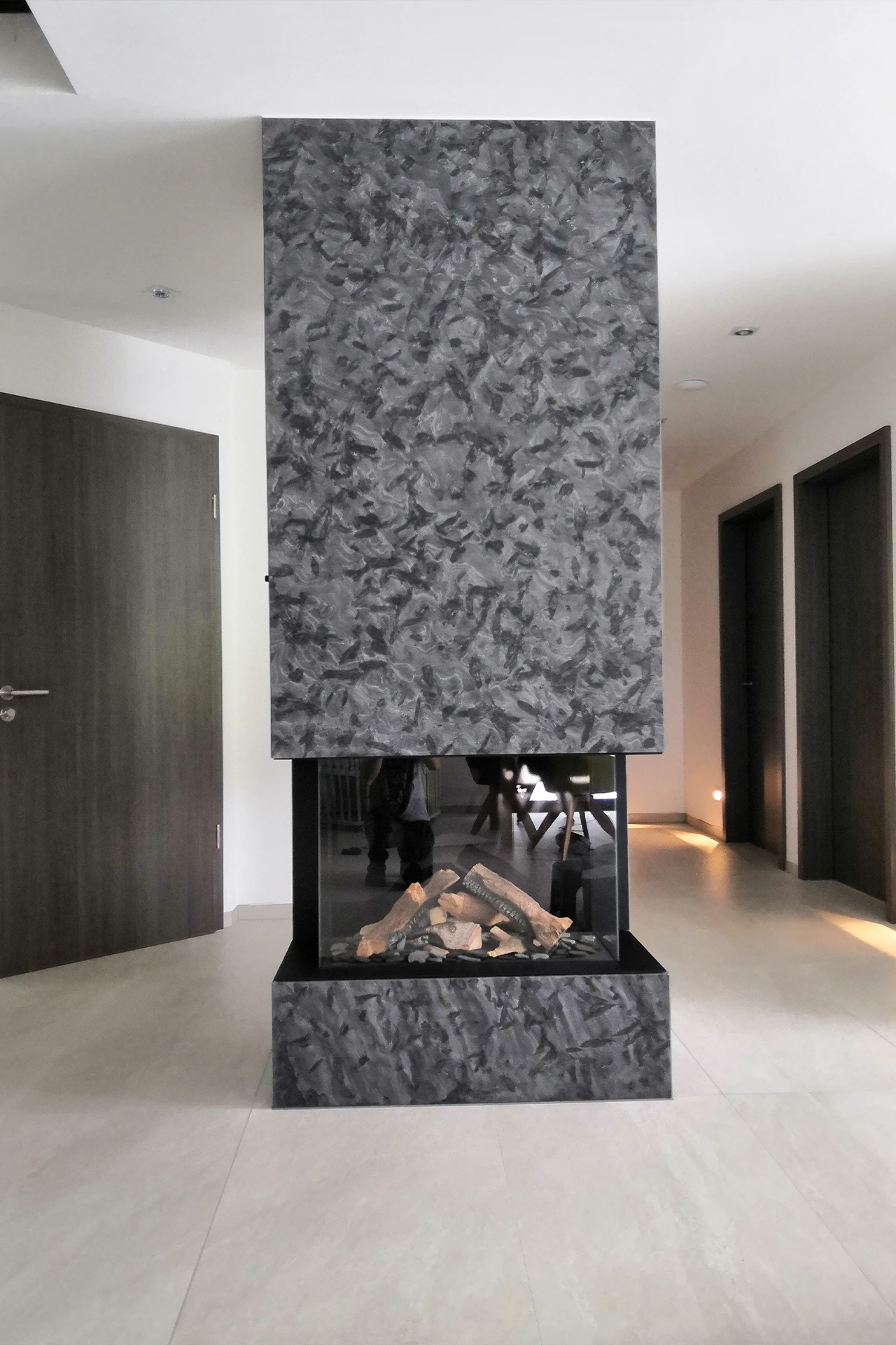 In Kombination mit der Glasfront des Kamins entsteht ein spannendes Zusammenspiel aus Feuer, Transparenz und dunklem Naturstein. Der Kamin wird so zum zentralen Gestaltungselement im Raum und verbindet Funktion mit ausdrucksstarkem Design.